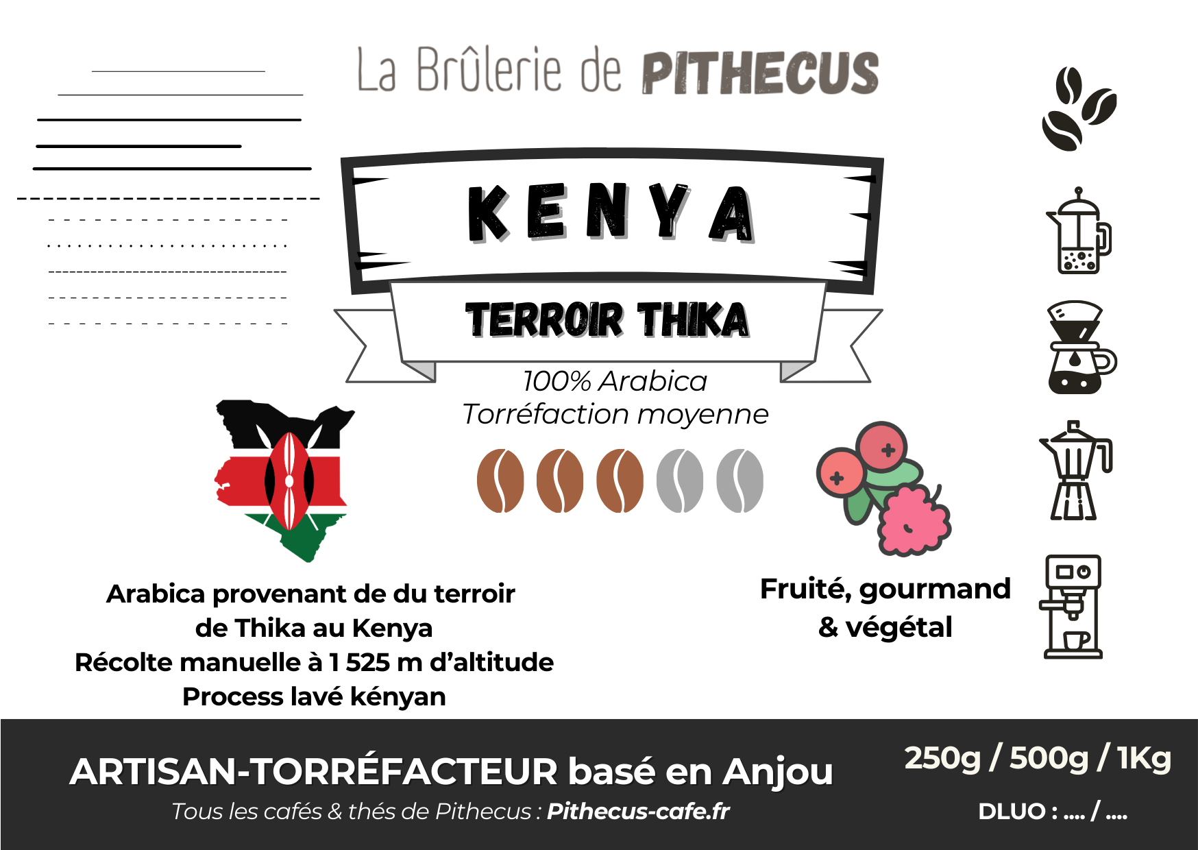 Arabica du Kenya (mission française) issu du terroir Thika récolté pendant la période d'octobre 2024 à janvier 2025.